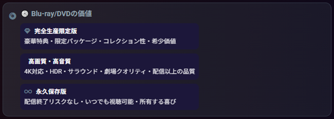 鬼滅の刃をBlu-rayで観る最大の価値は、「テレビ放送や配信では味わいきれない映像美・音響・特典をフルスペックで堪能できること」であり、シリーズが続くかぎり“長期的なコレクション資産”になる点にあります。